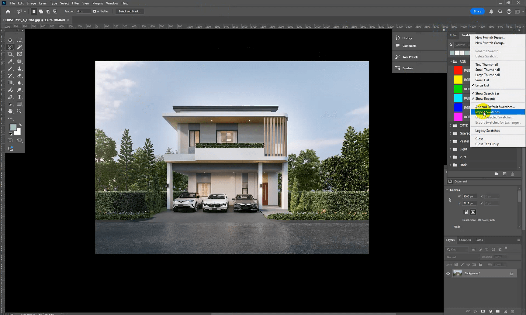 1. เปิดโปรแกรม Photoshop แล้วไปที่ Swatches จากนั้นคลิกที่ เมนู (ไอคอนสามขีดมุมขวาบน) แล้วเลือก Import Swatches