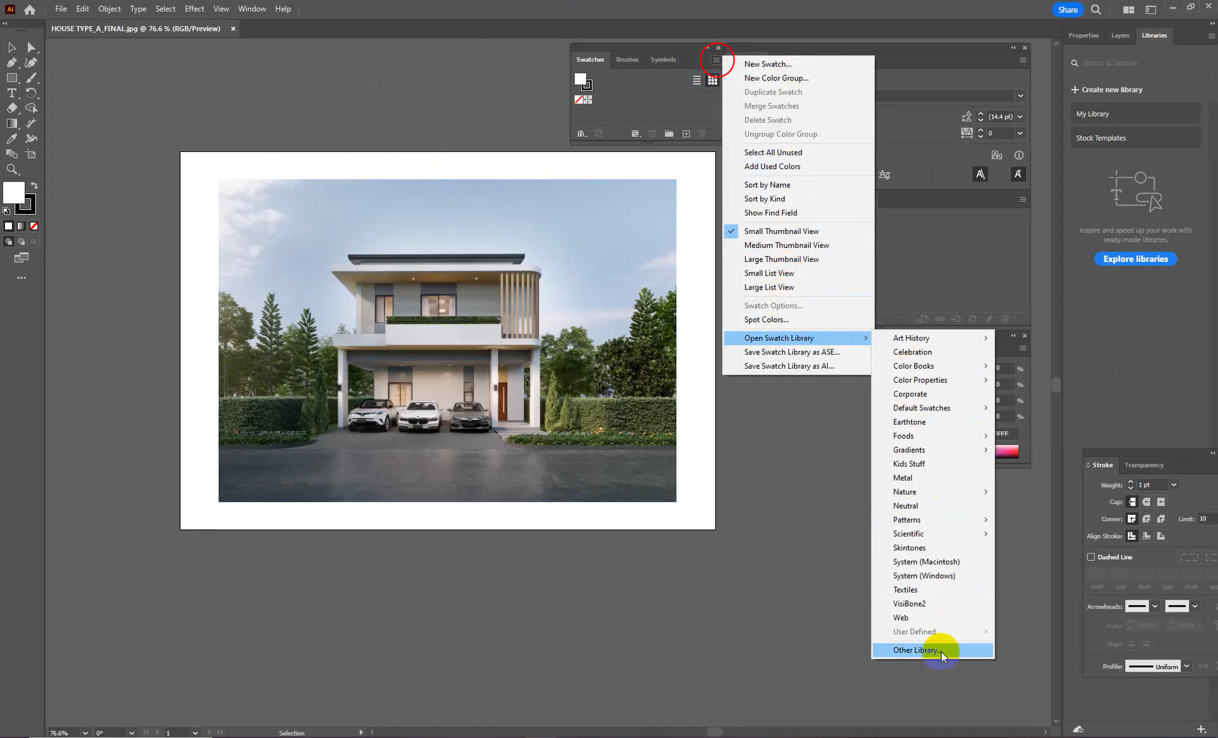 1. เปิดโปรแกรม Illustrator แล้วไปที่ Swatches จากนั้นคลิกเมนู Open Swatch Library และเลือก Other Library