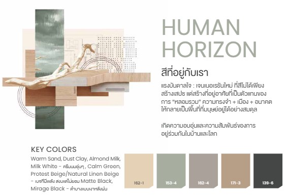 ขอบฟ้าใหม่ของการอยู่อาศัยที่หลอมรวมอดีต เมือง และอนาคตเข้าด้วยกัน เป็นสีที่เน้นการอยู่ได้จริง ให้ความรู้สึกอบอุ่น สมดุล และเป็นมิตรกับทุกเจเนอเรชัน ตั้งแต่เด็ก ผู้ใหญ่ ไปจนถึงผู้สูงอายุ สีในกลุ่มนี้สะท้อนความเป็นมนุษย์ ความสัมพันธ์ และการอยู่ร่วมกันอย่างกลมกลืนกับธรรมชาติ