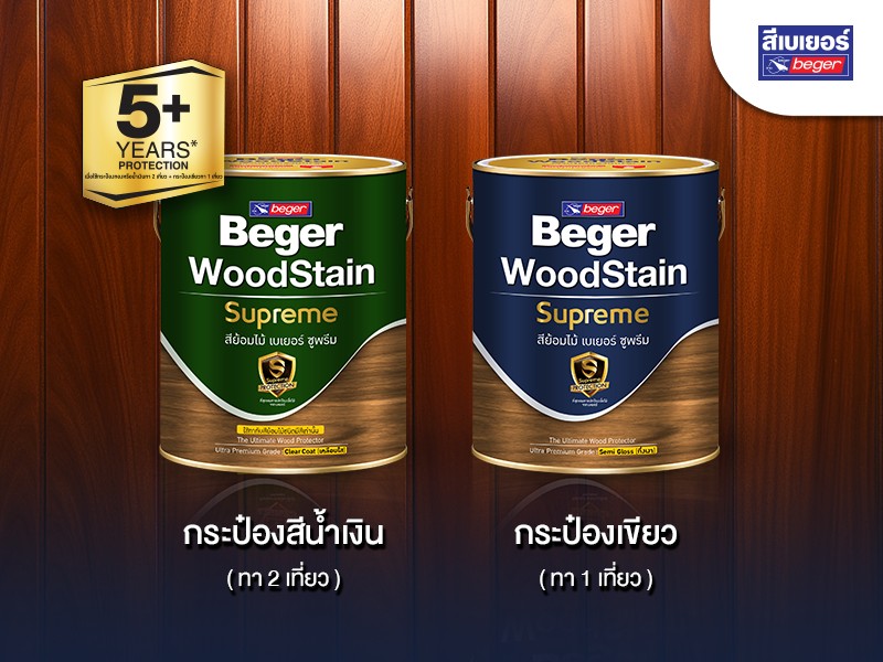 - ขั้นตอนถัดมา: ปิดท้ายด้วย Beger WoodStain Supreme Clear Coat ซึ่งเป็นสารเคลือบใส ช่วยเพิ่มความเงางามหรือผิวสัมผัสแบบด้าน พร้อมเสริมชั้นปกป้อง UV เชื้อรา และน้ำฝนให้กับไม้ในระยะยาว (ทา 1 เที่ยว)