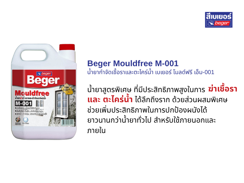 เบเยอร์ โมลด์ฟรี เอ็ม-001 (Beger Mouldfree M-001) –น้ำยากำจัดเชื้อราและตะไคร่น้ำ เป็นน้ำยาสูตรพิเศษ ที่มีประสิทธิภาพสูงในการฆ่าเชื้อรา และตะไคร่น้ำได้ลึกถึงราก ด้วยส่วนผสมพิเศษช่วยเพิ่มประสิทธิภาพ สามารถใช้ได้ทั้งภายในและภายนอก