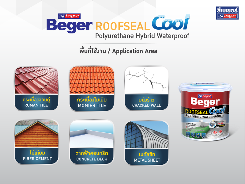 เบเยอร์ รูฟซีล คูล (Beger ROOFSEAL Cool) – สีทากันซึมชนิดโพลียูรีเทน ไฮบริด ที่ช่วยป้องกันการรั่วซึม 100% และยังสามารถสะท้อนความร้อนได้สูงสุดถึง 12°C เหมาะกับดาดฟ้าคอนกรีต หลังคาราบ และรอยต่อภายนอก