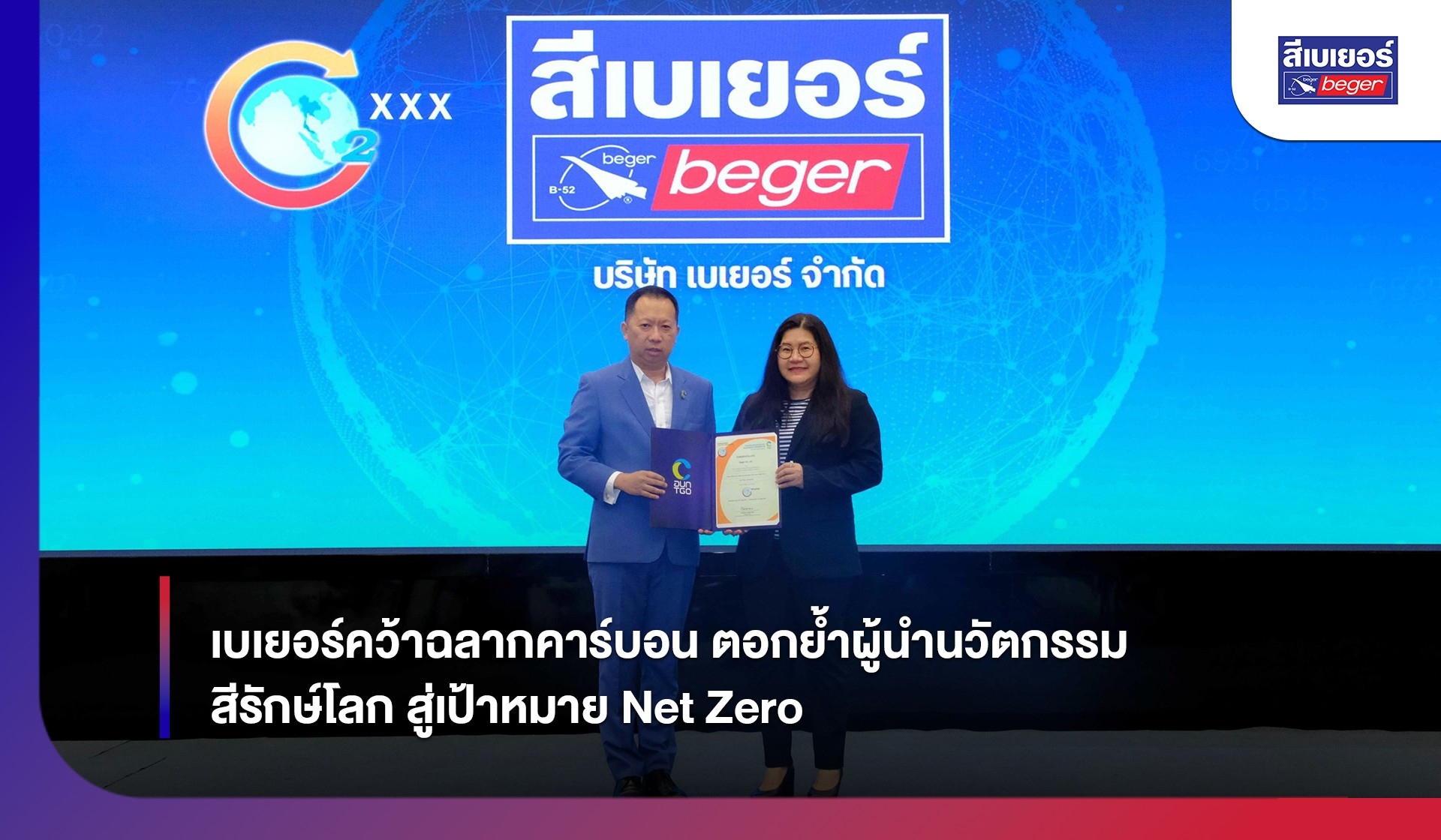 บริษัท เบเยอร์ จำกัด ผู้เชี่ยวชาญด้านสีนวัตกรรมรักษ์โลก ก้าวสู่ความสำเร็จอีกระดับ เมื่อ ดร.จารุรัตน์ ชัยยศบูรณะ ผู้บริหารกลุ่มบริษัทสีเบเยอร์ เข้ารับมอบ ประกาศนียบัตรฉลากคาร์บอน ประเภทคาร์บอนฟุตพริ้นท์ของผลิตภัณฑ์ (Carbon Footprint of Product : CFP) จากองค์การบริหารจัดการก๊าซเรือนกระจก (องค์การมหาชน) หรือ อบก. ในพิธีมอบประกาศนียบัตรเมื่อวันที่ 8 กันยายน 2568 ณ สถาบันเพื่อการยุติธรรมแห่งประเทศไทย (TIJ) ถนนแจ้งวัฒนะ
