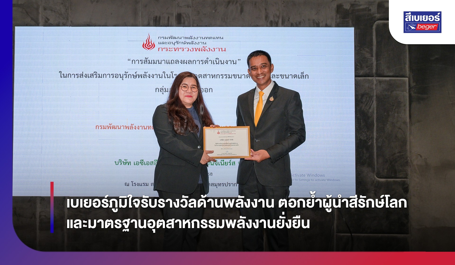 บริษัท เบเยอร์ จำกัด นำโดย ดร.จารุรัตน์ ชัยยศบูรณะ ผู้บริหารกลุ่มบริษัทสีเบเยอร์ เข้ารับรางวัลอันทรงเกียรติจาก กรมพัฒนาพลังงานทดแทนและอนุรักษ์พลังงาน กระทรวงพลังงาน ในงานสัมมนา “การส่งเสริมการอนุรักษ์พลังงานในโรงงานอุตสาหกรรมขนาดกลางและขนาดเล็ก กลุ่มภาคตะวันออก” ณ โรงแรมสยาม แมเนอร์ ริน่า จังหวัดสมุทรปราการ