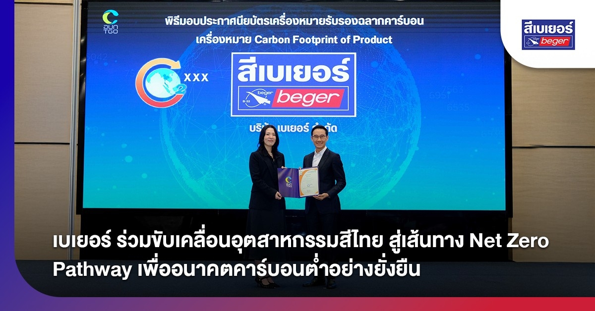 ในโอกาสเดียวกัน ดร.วรวัฒน์ ชัยยศบูรณะ ผู้บริหารบริษัท เบเยอร์ จำกัด ได้เข้ารับประกาศนียบัตร Carbon Footprint of Product (CFP) จากองค์การบริหารจัดการก๊าซเรือนกระจก ครอบคลุมผลิตภัณฑ์กว่า 177 SKU ซึ่งผ่านการประเมินตามหลักเกณฑ์ของ TGO ความสำเร็จนี้ทำให้เบเยอร์เป็นหนึ่งในบริษัทสีที่มีจำนวนผลิตภัณฑ์ได้รับการรับรองมากที่สุดในประเทศไทย ตอกย้ำถึงความมุ่งมั่นขององค์กรในการบริหารจัดการคาร์บอนอย่างโปร่งใส ตรวจสอบได้ และสอดคล้องกับมาตรฐานระดับสากล