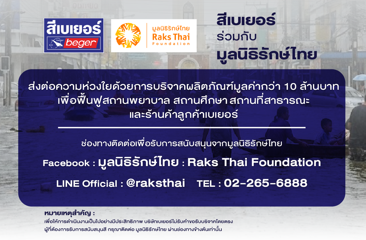 ท่ามกลางสถานการณ์นี้ สีเบเยอร์ (Beger) ตระหนักดีว่าการฟื้นฟูพื้นที่ประสบภัยไม่ใช่เพียงการซ่อมแซมอาคาร แต่คือการช่วยให้สถานพยาบาลกลับมาให้บริการ สถานศึกษาเริ่มต้นการเรียนการสอนได้อีกครั้ง สถานที่สาธารณะกลับมาดำเนินการได้ตามปกติ รวมถึงร้านค้าและธุรกิจรายย่อยสามารถเดินหน้าต่อได้อย่างมั่นคง ด้วยความตั้งใจที่จะเคียงข้างสังคมไทยในยามลำบาก เบเยอร์จึงได้ร่วมมือกับ มูลนิธิรักษ์ไทย (Raks Thai Foundation) เพื่อวางระบบการช่วยเหลือและลงพื้นที่ฟื้นฟูอย่างต่อเนื่อง
