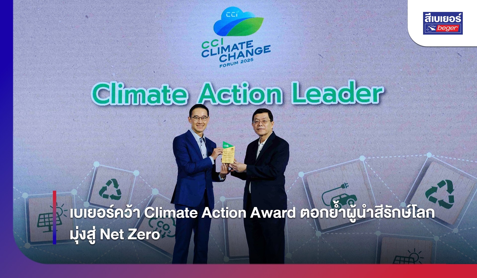 บริษัท เบเยอร์ จำกัด นำโดย ดร.วรวัฒน์ ชัยยศบูรณะ ประธานเจ้าหน้าที่บริหาร คว้ารางวัล Climate Action Award ประเภท “Climate Action Leader” ในงานสัมมนาวิชาการ Climate Change Forum 2025: Driving towards Net Zero จัดโดยสถาบันการเปลี่ยนแปลงสภาพภูมิอากาศ (CCI) ภายใต้สภาอุตสาหกรรมแห่งประเทศไทย (ส.อ.ท.) ณ อาคารเอ็ม ทาวเวอร์ ถนนสุขุมวิท กรุงเทพฯ