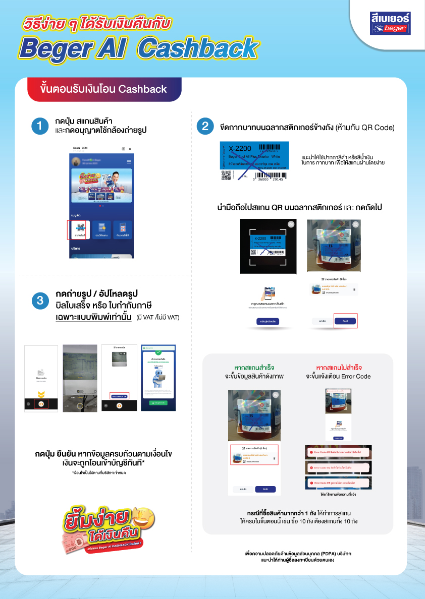 แคมเปญ Beger AI V.2 Cashback “ยิ้มง่ายได้เงินคืน ถูกออกแบบมาเพื่อให้ทุกคนที่เลือกใช้สีคุณภาพจากเบเยอร์ได้รับความคุ้มค่าสูงสุด ทั้งในด้านคุณภาพ ความทนทาน ความปลอดภัย และผลตอบแทนที่ได้กลับมาในรูปแบบเงินคืนจริง ช่วยให้คุณประหยัดงบ และวางแผนงานรีโนเวทบ้านได้อย่างสบายใจยิ่งขึ้น เพียงแค่สแกนข้างถัง ส่งใบเสร็จ และรอการตรวจสอบ คุณก็สามารถ “ยิ้มง่ายได้เงินคืน” ได้ทันทีในทุกขั้นตอน