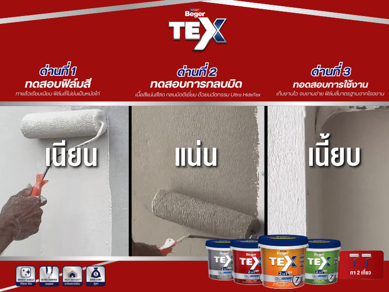 Beger TEX 2in1 ถูกออกแบบให้เป็น สีไม่ผสมน้ำ ใช้งานง่ายในขั้นตอนเดียว ประหยัดเวลาแต่ได้ผนังสวยทนยาวนาน พร้อมเทคโนโลยี Pro Active Titanium ที่ช่วยให้บ้านเย็นและผนังดูใหม่อยู่เสมอ