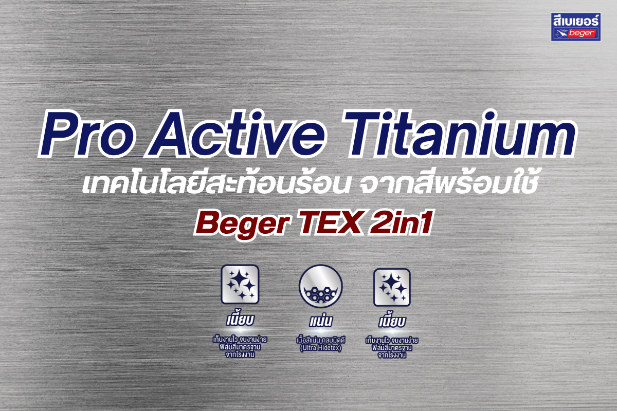 ในงานทาสีผนังภายนอก ปัญหาที่พบบ่อยคือผนังซีดเร็ว เกิดคราบสกปรก และร้อนอบอ้าวจากแสงแดด “Beger TEX 2in1” จึงถูกพัฒนาขึ้นในรูปแบบ สีพร้อมใช้ (Ready to Use Paint) ไม่ต้องผสมน้ำ และเป็น สี 2in1 ไม่ต้องรองพื้น ที่มาพร้อมเทคโนโลยีเฉพาะจากเบเยอร์ — Pro Active Titanium เพื่อยกระดับทั้ง “ความสวย” และ “ความทน” ไปพร้อมกัน
