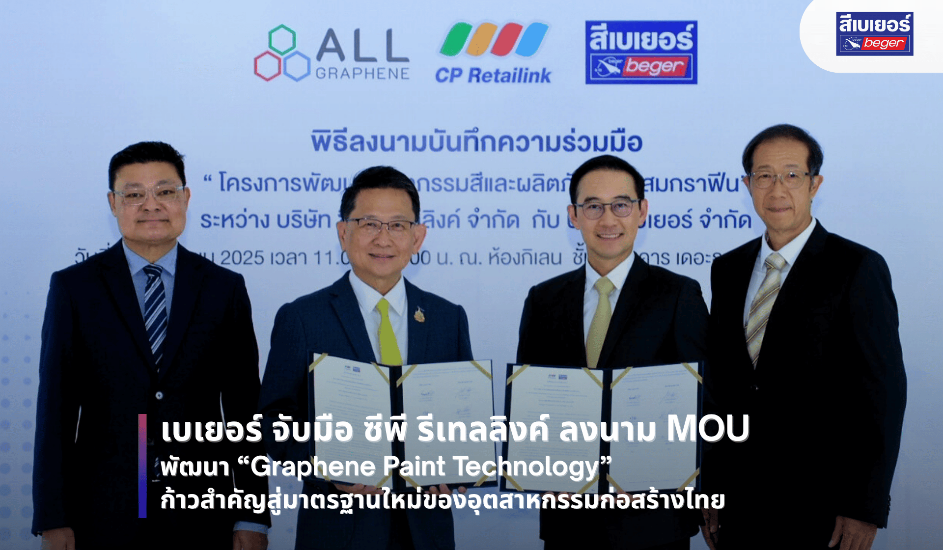 กรุงเทพฯ – 30 กันยายน 2568 – บริษัท เบเยอร์ จำกัด (Beger) ผู้นำด้านนวัตกรรมสีทาอาคารและเคมีภัณฑ์ก่อสร้างของไทย ลงนามบันทึกข้อตกลงความร่วมมือ (MOU) กับ บริษัท ซีพี รีเทลลิงค์ จำกัด (CP Retailink) บริษัทในเครือซีพีที่มีความเชี่ยวชาญและความมั่นคงทางธุรกิจระดับประเทศ เพื่อร่วมพัฒนา “Graphene Paint Technology” นวัตกรรมสีรุ่นใหม่ที่ยกระดับมาตรฐานคุณภาพ ความทนทาน และความยั่งยืนในอุตสาหกรรมก่อสร้างไทย