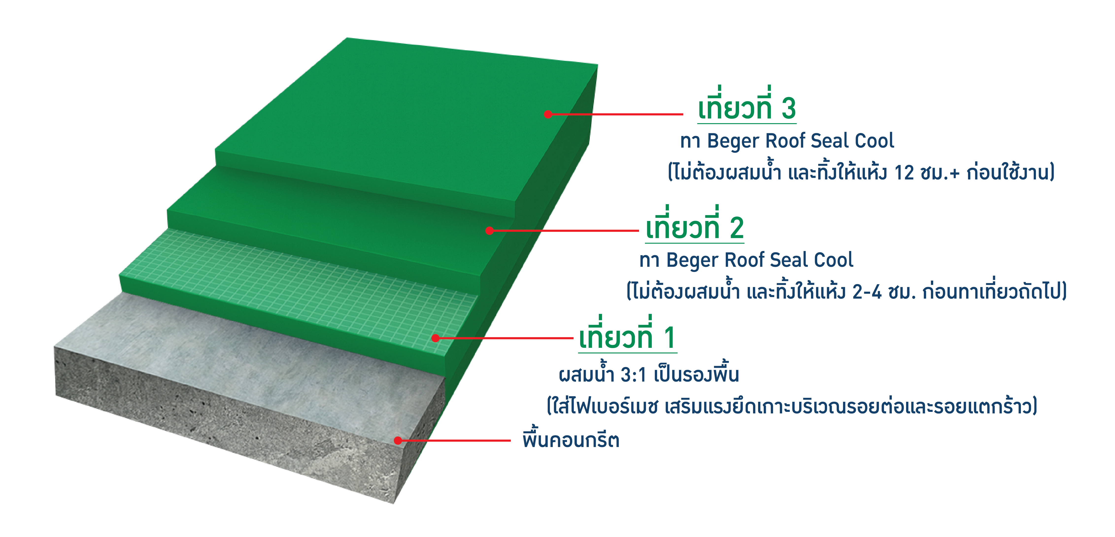 ทาหรือกลิ้ง เบเยอร์ รูฟซีล คูล (ไม่ต้องผสมน้ำ) ชั้นที่ 1 ทิ้งให้แห้ง 2 - 4 ชั่วโมง และ ทา หรือกลิ้ง เบเยอร์ รูฟซีล คูล (ไม่ต้องผสมน้ำ) ชั้นที่ 2 ทิ้งให้ฟิล์มสีแห้งอย่างน้อย 12 ชั่วโมง ก่อนการใช้งาน